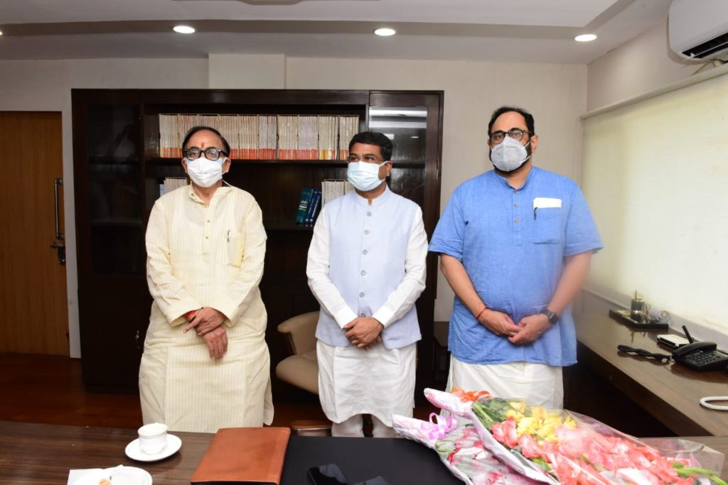 Shri Dharmendra Pradhan assumed charge of the Ministry of Skill Development and Entrepreneurship as Cabinet Minister and Shri Rajeev Chandrasekhar, Member of Parliament, Rajya Sabha, from Karnataka, took office as the Minister of State (MoS) of Ministry of Skill Development and Entrepreneurship. Dr. Mahendra Nath Pandey, who was Minister of Skill Development and Entrepreneurship before yesterday’s Cabinet reshuffle, was also present on the occasion and extended his best wishes to both minsters on taking office.