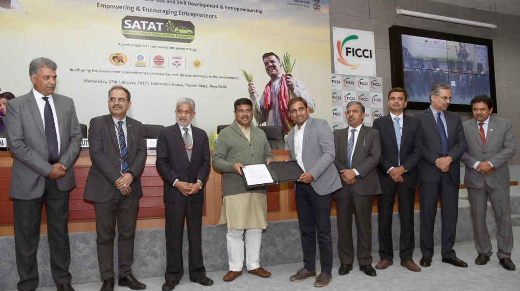 Minister of Petroleum and Natural Gas & Skill development and Entrepreneurship Shri Dharmendra Pradhan today handed over the 100th Letter of Intent (LOI) to the Compressed Bio-Gas(CBG) Entrepreneur (producer) under the SATAT scheme. SATAT is an initiative aimed at providing a Sustainable Alternative Towards Affordable Transportation as a developmental effort that would benefit both vehicle-users as well as farmers and entrepreneurs.